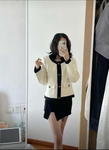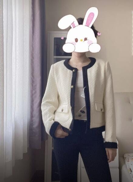 This elegant white and black short coat is designed in a classic Chanel-style with a luxurious blend of 70% wool and 30% polyester for warmth and softness. The black trim is made of 50% wool and 50% acrylic, adding a stylish contrast. Lined with 100% Lyocell fiber, the coat offers a smooth, comfortable fit. Ideal for casual outings or sophisticated winter looks, this timeless piece is a must-have for any wardrobe.